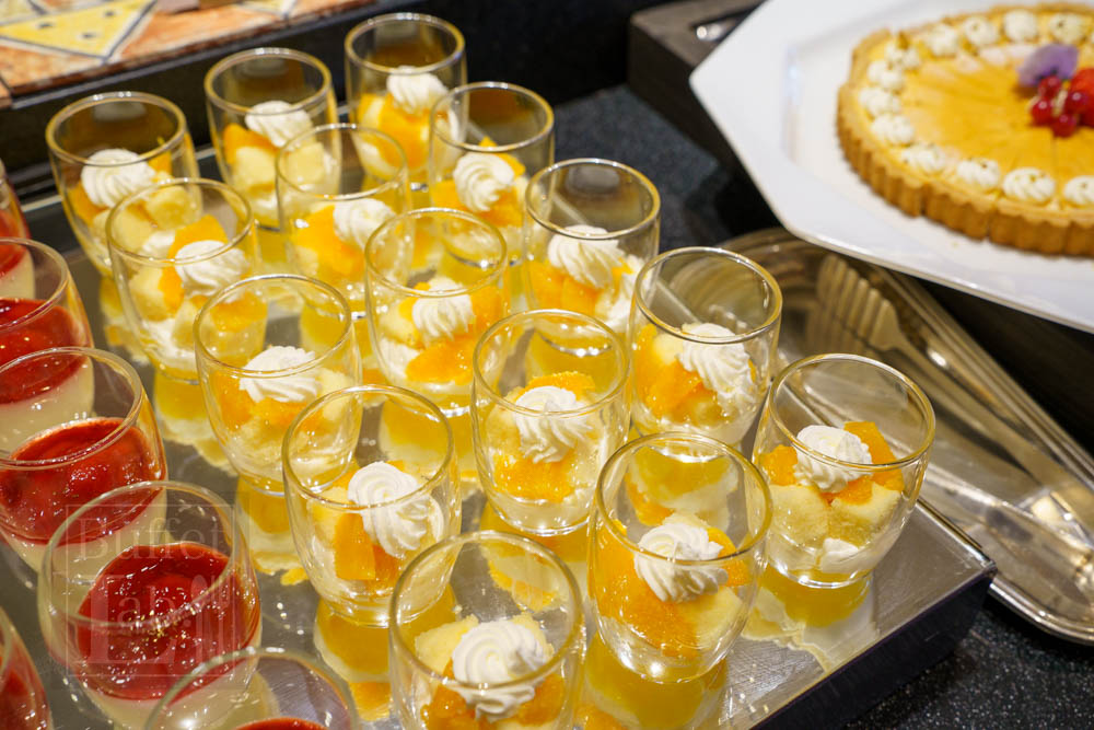 - オレンジのトライフル:オレンジの爽やかさと、しっとりスポンジ、クリーム、ほろ苦いソースのバランスが良いグラススイーツ。